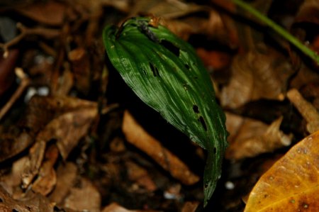 | オオオサランが開花しているとの情報を得て、急遽、花を見に行って来ました。一株の花の開花期は1週間程度と短いので、果たして残っているだろうかと不安を抱きながら山へ入りました。聞いていた株は案の定すでに散っていて、かろうじて2輪だけ残っていました。気落ちしながら、周辺をくまなく調査してみると満開状態の良好な株が何株もあり、状態の良い写真が多数撮れました。まだ蕾の状態の株も何株もありましたので、しばらくは楽しめそうです。また、嬉しいことに、群落の数が増加していて、大株になっているのもたくさんありました。さらに、最近激減して滅多に見ることができなくなっているシコウランの大株が、岩場にしっかりと着生しているのが確認できました。 帰り際、コノハチョウが姿を見せて、目の前に止まってポーズを取ってくれました。 |