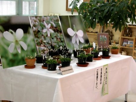 | 2005年沖縄県すみれ愛好会「すみれ展」 「沖縄県すみれ愛好会」の2005年度の「すみれ展」は、3月5日(土)〜6日(日)の2日間「那覇市緑化センター」において開催され、会員が1年間、丹精込めて栽培した約500鉢のすみれと山野草が展示されました。 今回は、オリヅルスミレ(海洋博覧会記念公園管理財団・都市緑化植物園提供)を始めとして、沖縄県に自生する基本種(無茎種、有茎種)全品種の開花株が出そろいました。沖縄産、本土産、外国産のコーナーを設けて展示しました。 そして、リュウキュウコスミレ、リュウキュウシロスミレのさまざまなバリエーションをまとめました。中でも、オリヅルスミレの開花株の展示はなかなか見る事が出来ませんので、皆さん大変熱心に観察していました。また、壁面には、すみれについてのパネルや会員の描いた絵、短歌や俳句の色紙等も展示されました。さらに、すみれ関係書籍、すみれグッズのさまざまなコレクションが数多く展示され、好評でした。栽培相談等も会員が丁寧に対応しました。 今年は、関東・関西・山梨・広島から5組12名の方がわざわざ駆けつけてくれました。この場を借りてお礼を申し上げます。ありがとうございました。 |